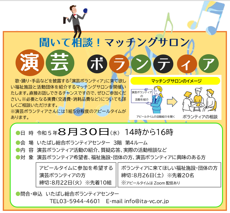 トップ > 新着情報 > センターから > 8/30(水)聞いて相談マッチングサロン 演芸ボランティア