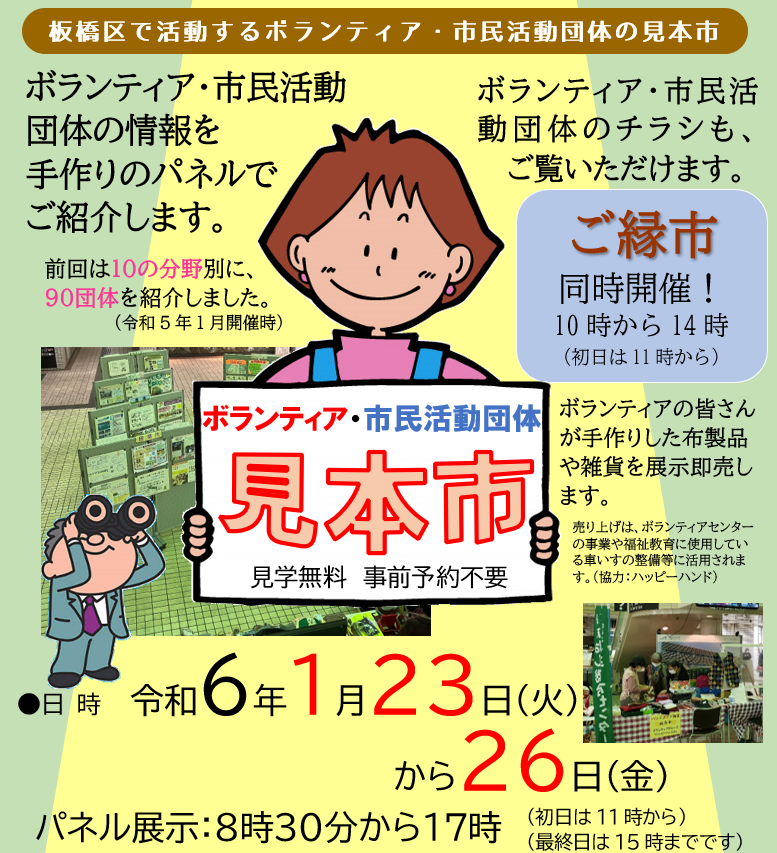 2024年1/23(火)~:いたばしボランティア・市民活動団体見本市 と ご縁市 開催♪(新規パネル掲示団体募集中:1/16(火)締切)