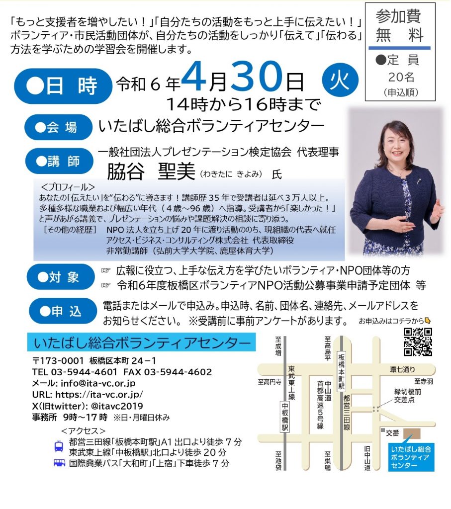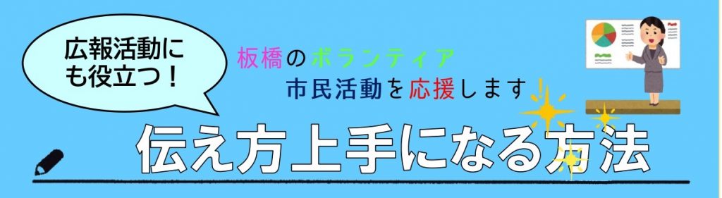 【対 象】 広報に役立つ、上手な伝え方を学びたいボランティア・NPO団体等の方 、令和6年度板橋区ボランティアNPO活動公募事業の申請を予定している団体 等