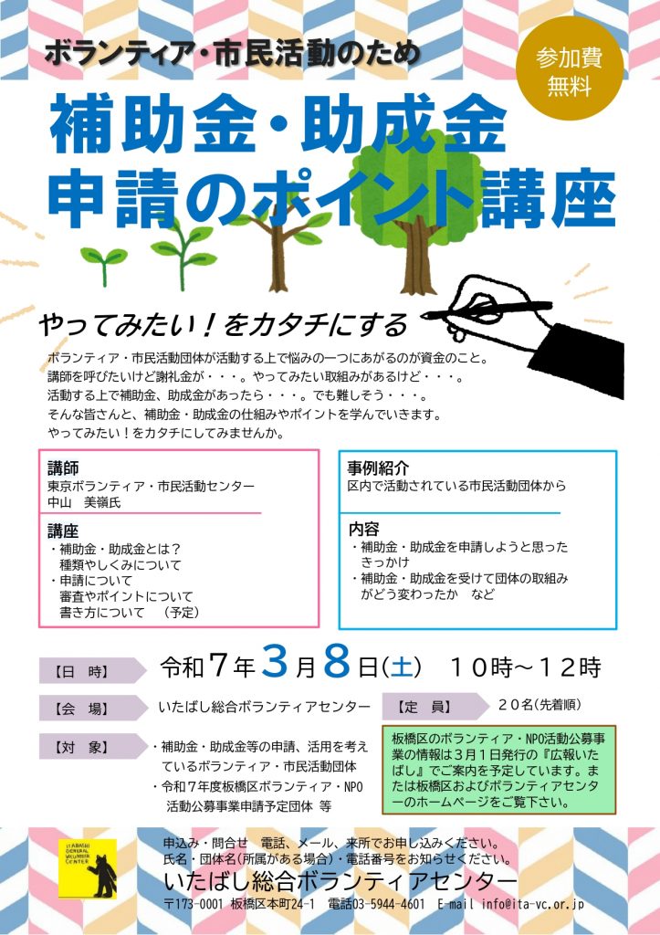 3/8(土)10時 ボランティア・市民活動向け『補助金・助成金申請のポイント講座』受講者募集!