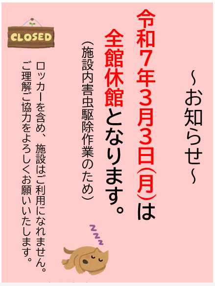 3月3日(月)全館休館のお知らせ
