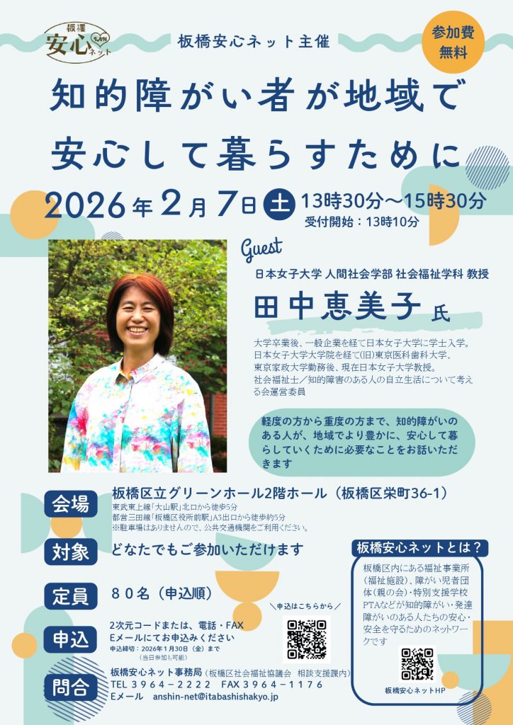 | 内容 | ◆日時 2月7日(土)13時30分から15時30分 (受付開始 13時10分) ◆場所 区立グリーンホール 2階ホール(栄町36-1) ◆講師 田中 恵美子 氏(日本女子大学人間社会学部社会福祉学科教授) ◆内容 軽度の方から重度の方まで、知的障がいのある人が、地域でより豊かに、安心してくらしていくために必要なことをお話いただきます。 ◆定員 80名(申込順) ◆申込方法 フォームからお申込みください。 以下のURLよりお申込み下さい。 https://x.gd/XKtEE お電話、FAX、メールでのお申込みも可能です。 |