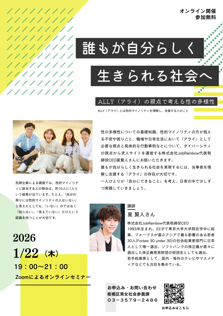 | 内容 | 性の多様性についての基礎知識や当事者の方々の不安や悩みを理解し、性のあり方に関係なく誰もが生きやすい社会をつくるために必要なことについて、株式会社JobRainbow代表取締役CEOの星賢人さんにお話していただきます。 ※ALLY(アライ)とは、性的マイノリティを理解し、支援する人のこと 日時:1月22日(木)19時~21時 (Zoomによるオンライン開催) |